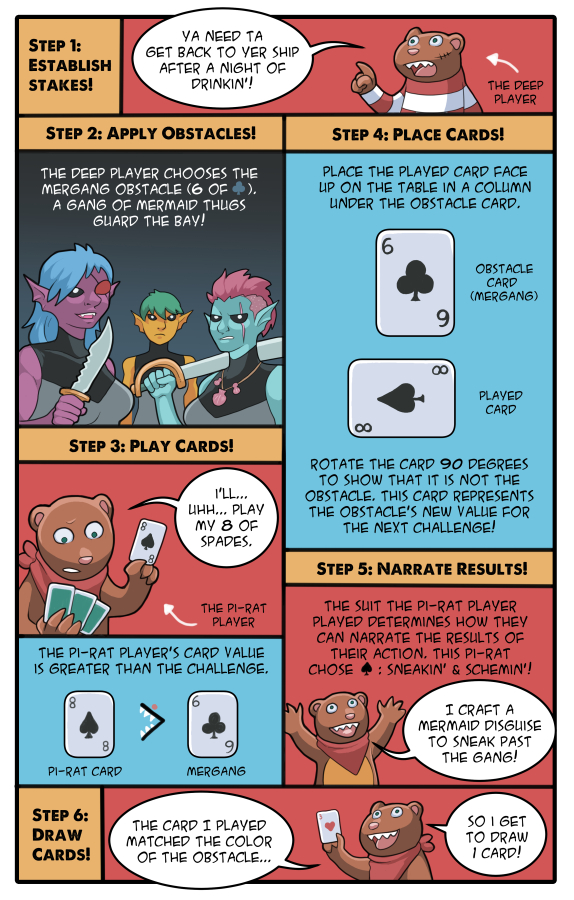 Using a standard deck of playing cards (all 54 of them), Pi-Rats will face Obstacles, like hot, Loitering Mermaids, or slippery Fish Storms, and overcome Challenges, like sneakin’ through Shipwrecker Graveyards, or cannon battlin’ Fairy Fortresses, as they work to accomplish both their Personal and Crew Objectives. Particularly difficult Challenges may even require the use of Secret Pirate Techniques: powerful skills and talents known only to a worthy few that can be used to overcome any threat to a proper pirate! Players will get to design their very own Secret Pirate Techniques for the Pi-Rat crew to use, and the crazier or more ridiculous the idea, the better!
